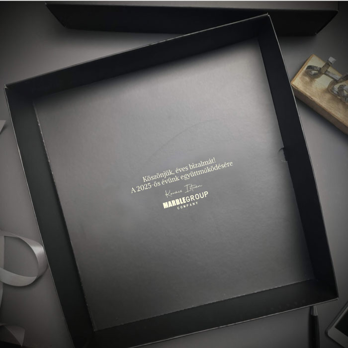 A fedél belsejébe megadhatsz egy szöveget a partnereidnek amit aranyozással égetünk a fedél belső részébe ami kinyitás után olvasható majd